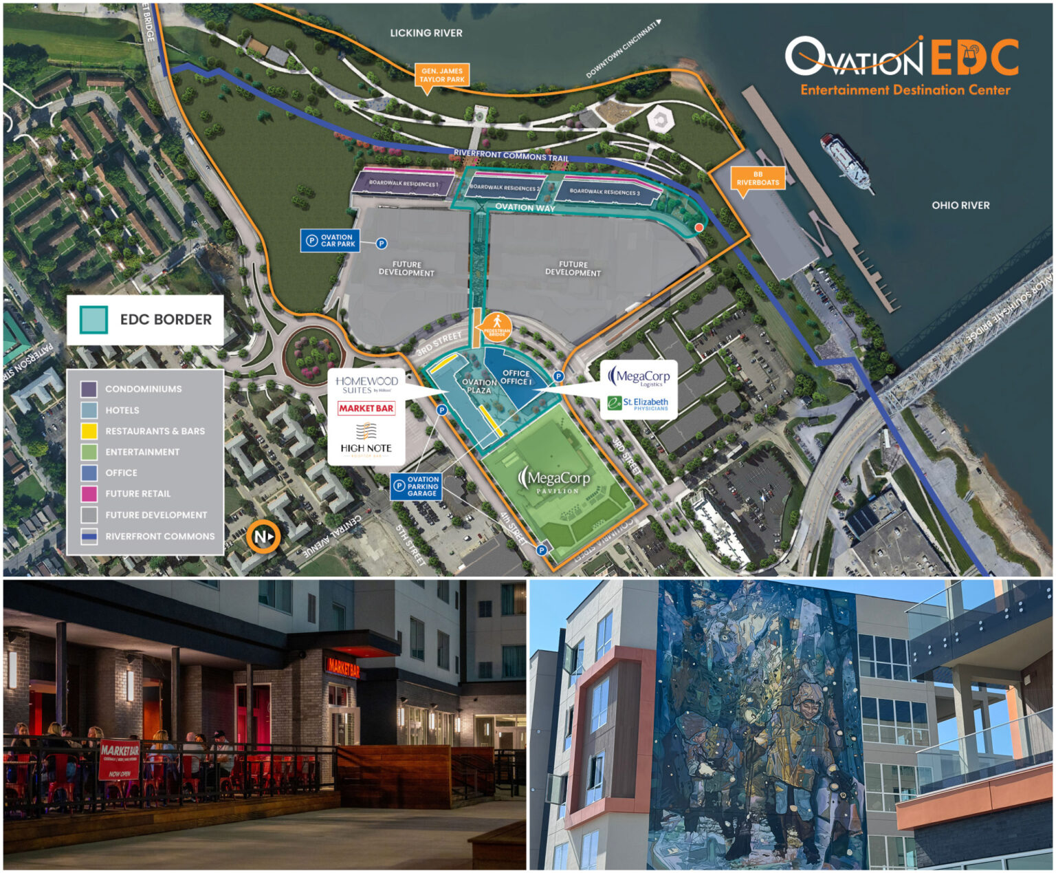 Ovation is a nearly 25-acre, five-city block equivalent urban, mixed-use development along the confluence of the Ohio and Licking Rivers in Northern Kentucky. The community is host to a world-class music venue, state-of-the-art office buildings, residential options, a hotel, bars and open spaces. Once complete, Ovation will be an iconic regional destination, offering unique public artworks, restaurants, bars and experiences to visitors, connecting residents and the community directly to the rivers with an unbeatable view of the Cincinnati skyline.